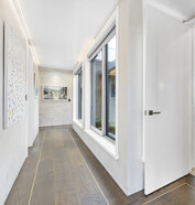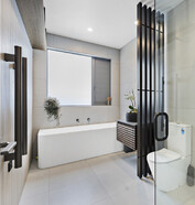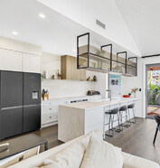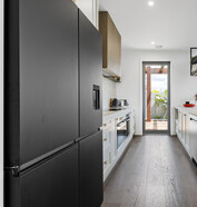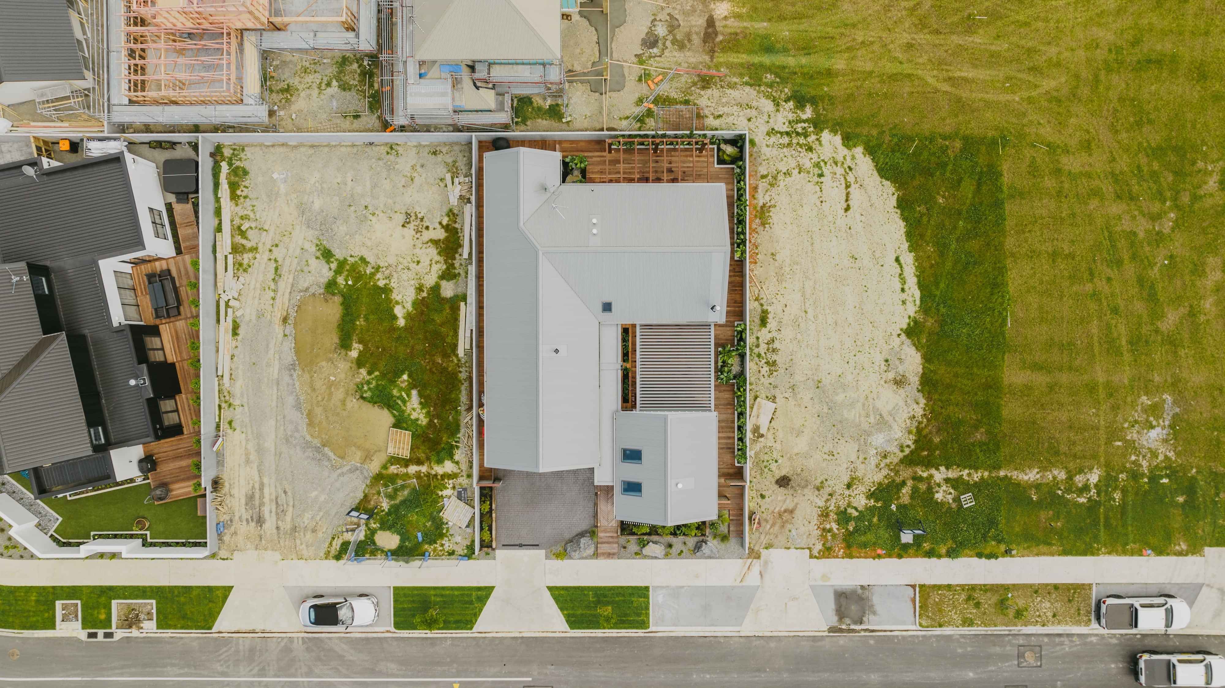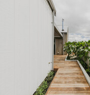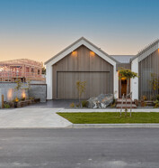 This modern home makes the most of a smaller section with white board and batten cladding, warm cedar detailing, and a vertical slat feature for added privacy and striking street appeal. Clever landscaping and considered planting bring life and depth to the exterior, while a wraparound deck connects the areas within the home.