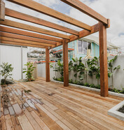 A mix of covered and open outdoor areas—including an open pergola featuring reclaimed Aussie hardwood beams—offers versatile spaces for relaxing and entertaining.