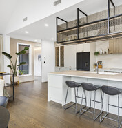 Inside, high ceilings, large windows, and ranch sliders flood the home with natural light, creating a bright, airy atmosphere. The minimalist design is elevated by oak flooring, a simple yet functional kitchen with open hanging shelves, and plenty of built-in storage throughout. Clean, warm, and cleverly laid out—this home proves that small sections can deliver big impact.