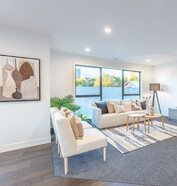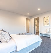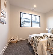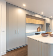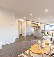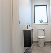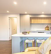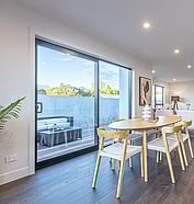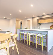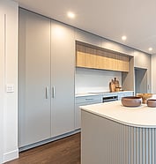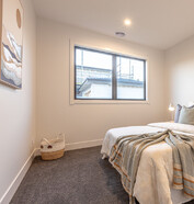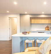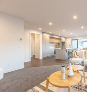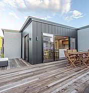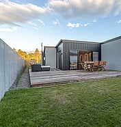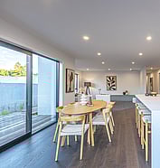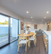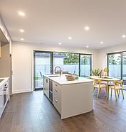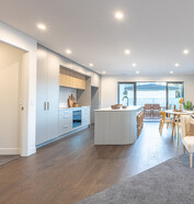The dark garage door creates striking contrast against the minimalist exterior, while clever landscaping and wraparound decking enhance the flow around the home. Inside, the open-plan living space is light-filled and functional, featuring two ranch sliders that open to different areas of the deck - perfect for effortless indoor-outdoor living. A clean, shaker-style kitchen ties in beautifully with the home’s paired-back aesthetic, combining style and practicality in one refined, modern package.