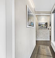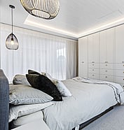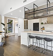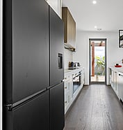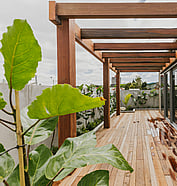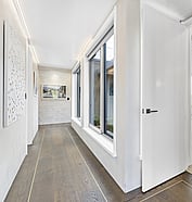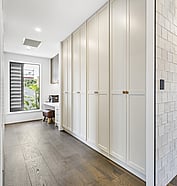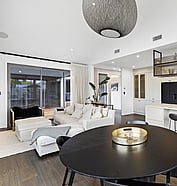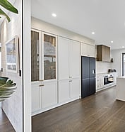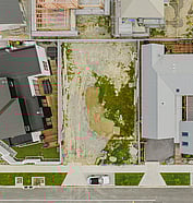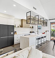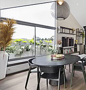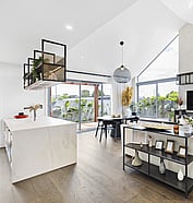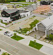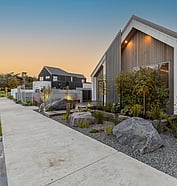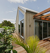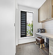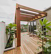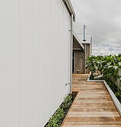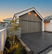 This modern home makes the most of a smaller section with white board and batten cladding, warm cedar detailing, and a vertical slat feature for added privacy and striking street appeal. Clever landscaping and considered planting bring life and depth to the exterior, while a wraparound deck connects the areas within the home.