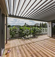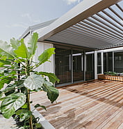 A mix of covered and open outdoor areas—including an open pergola featuring reclaimed Aussie hardwood beams—offers versatile spaces for relaxing and entertaining.