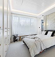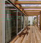 Modern minimalist home with white cladding, expansive deck, and seamless indoor-outdoor flow.